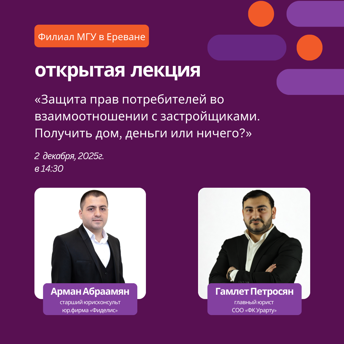 2 декабря 2025 года в конференц-зале Филиала МГУ имени М.В. Ломоносова в Ереване состоялась встреча студентов с выпускниками — Гамлетом Петросяном и Арманом Абраамяном, окончившими бакалавриат Филиала с отличием. Сегодня Гамлет Петросян занимает должность главного юриста СОО «ФК Урарту», а Арман Абраамян работает старшим юрисконсультом юридической фирмы «Фиделис». Открытая лекция «Защита прав потребителей во взаимоотношениях […]