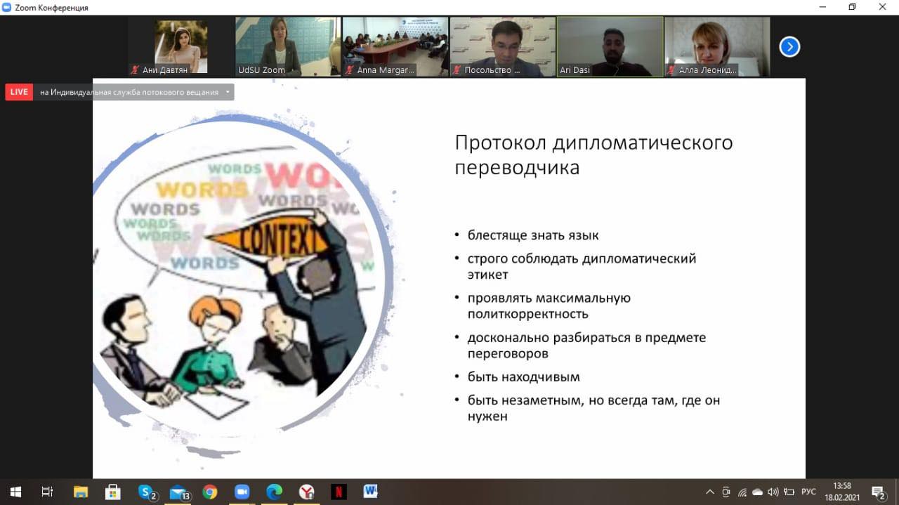 18 февраля 2021 года на площадке Российского центра науки и культуры в Ереване при поддержке Посольства РФ в РА студенты и учащиеся старших классов школ Армении в онлайн-режиме отметили День юного дипломата. В мероприятии приняли участие также студенты 1,2 курсов направления подготовки «Международные отношения» филиала МГУ в Ереване.