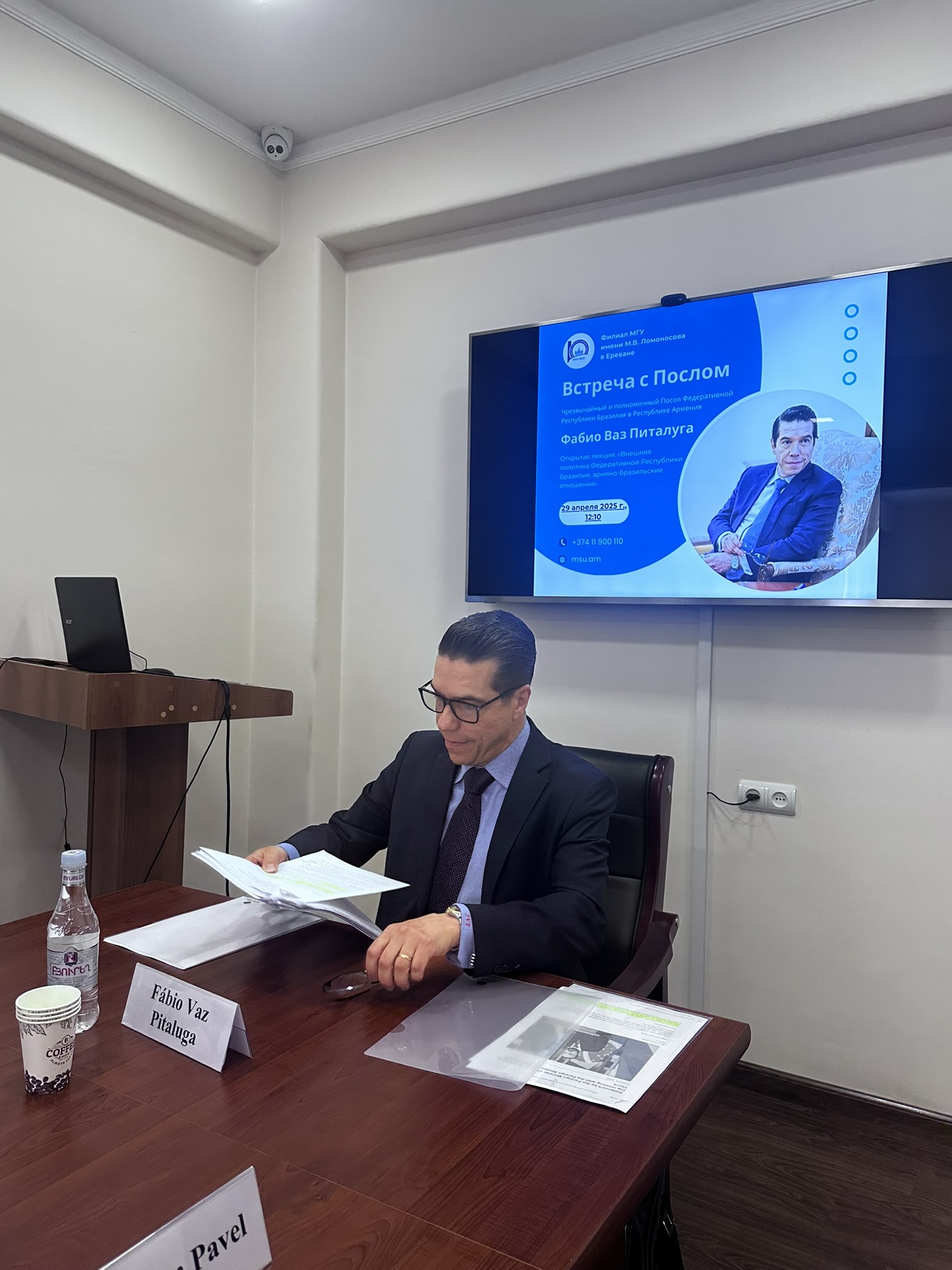 29 апреля 2025 года Филиал МГУ в Ереване посетил Чрезвычайный и Полномочный посол Федеративной Республики Бразилия в Республике Армения Фабио Ваз Питалуга. В ходе визита Посол ознакомился с инфраструктурой Филиала, аудиториями, работой библиотеки, после чего состоялась встреча с исполнительным директором Филиала П.Д. Сафаряном. В рамках встречи обсуждались вопросы культурного и гуманитарного сотрудничества между Посольством и […]
