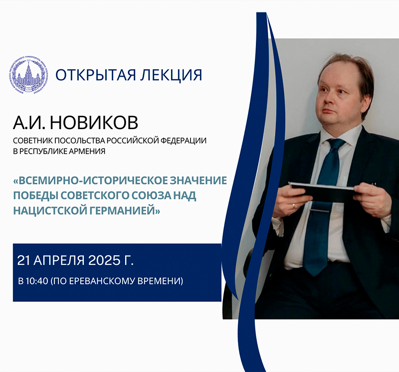 Тема: «Всемирно-историческое значение Победы Советского Союза над нацистской Германией» Лектор: Советник Посольства Российской Федерации в Республике Армения А.И. Новиков Дата мероприятия:21 апреля 2025 г. Начало:в 10:40 (по ереванскому времени) Мероприятие пройдет в очном формате по адресу: Филиал МГУ имени М.В. Ломоносова в городе Ереван РА, 0025 г. Ереван, ул. Вардананц, д. 17. Мероприятие проводится в […]