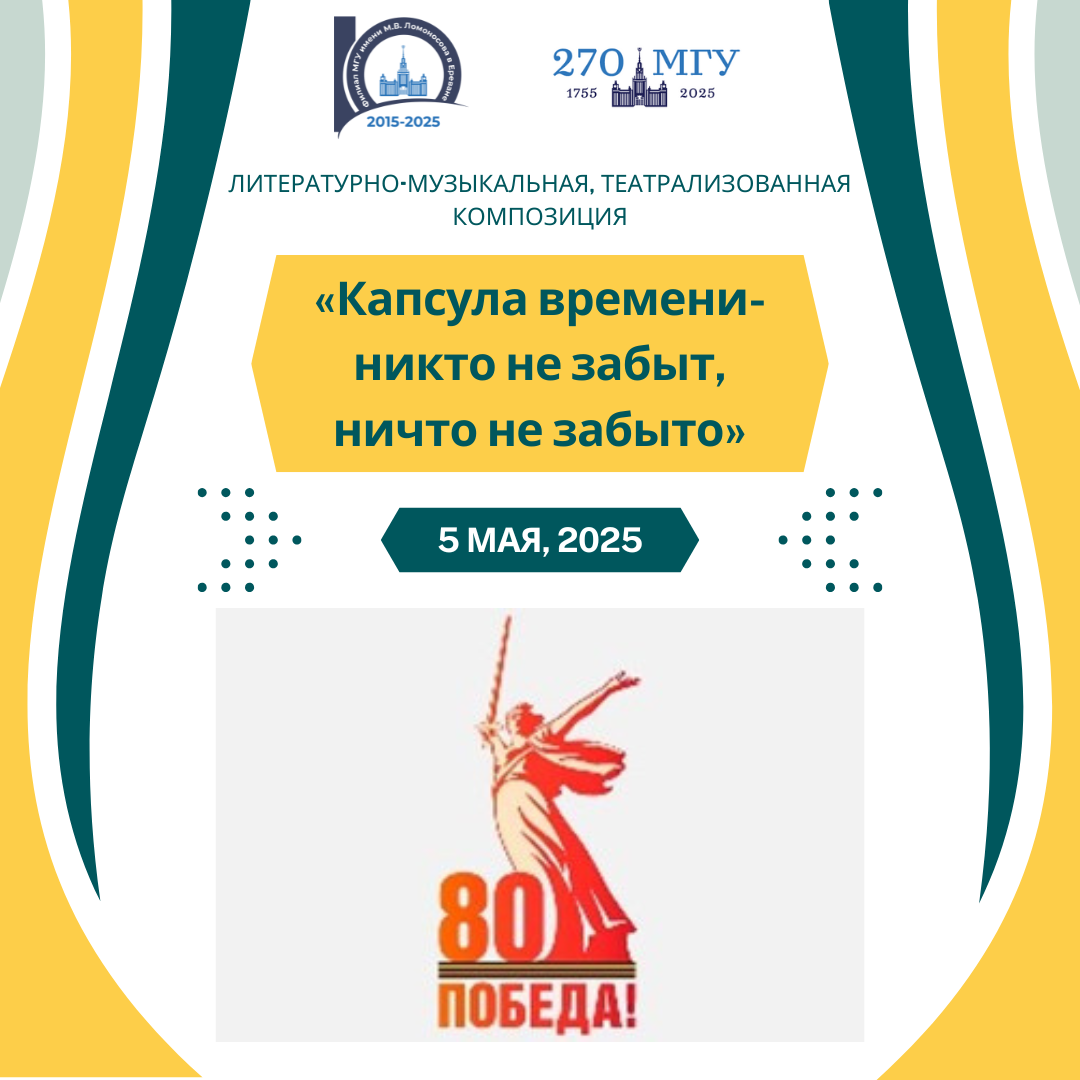 Литературно-музыкальная, театрализованная композиция: «Капсула времени — никто не забыт, ничто не забыто» Дата мероприятия: 5 мая 2025 г. Начало: в 10:30 (по ереванскому времени) Мероприятие пройдет в очном формате по адресу: Филиал МГУ имени М.В. Ломоносова в городе Ереван РА, 0025 г. Ереван, ул. Вардананц, д. 17. Актовый зал Мероприятие проводится в рамках празднования: * […]