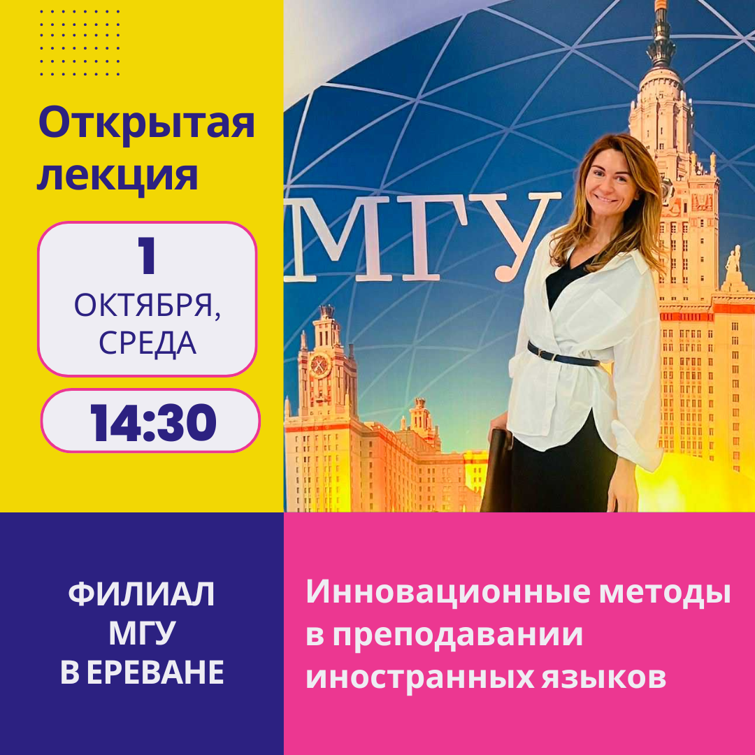 Тема лекции: «Инновационные методы в преподавании иностранных языков» (на английском языке) Лектор: преподаватель факультета иностранных языков и регионоведения МГУ имени М.В. Ломоносова, кандидат педагогических наук, доцент Александра Николаевна Колесникова. Дата мероприятия: 1 октября 2025 г. Начало: в 14:30 (по ереванскому времени) Мероприятие пройдет в очном формате по адресу: Филиал МГУ имени М.В. Ломоносова в городе […]