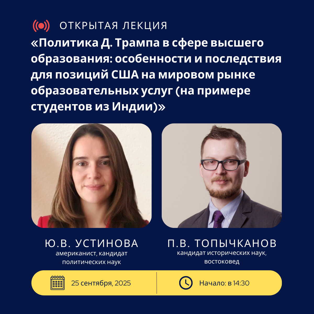 Тема лекции: «Политика Д. Трампа в сфере высшего образования: особенности и последствия для позиций США на мировом рынке образовательных услуг (на примере студентов из Индии)» Лекторы: соруководитель магистерской программы «Региональные проблемы мировой политики» факультета мировой политики МГУ имени М. В. Ломоносова, руководитель Сектора новых вызовов в Южной и Юго-Восточной Азии ИМЭМО имени Е.М. Примакова РАН, […]