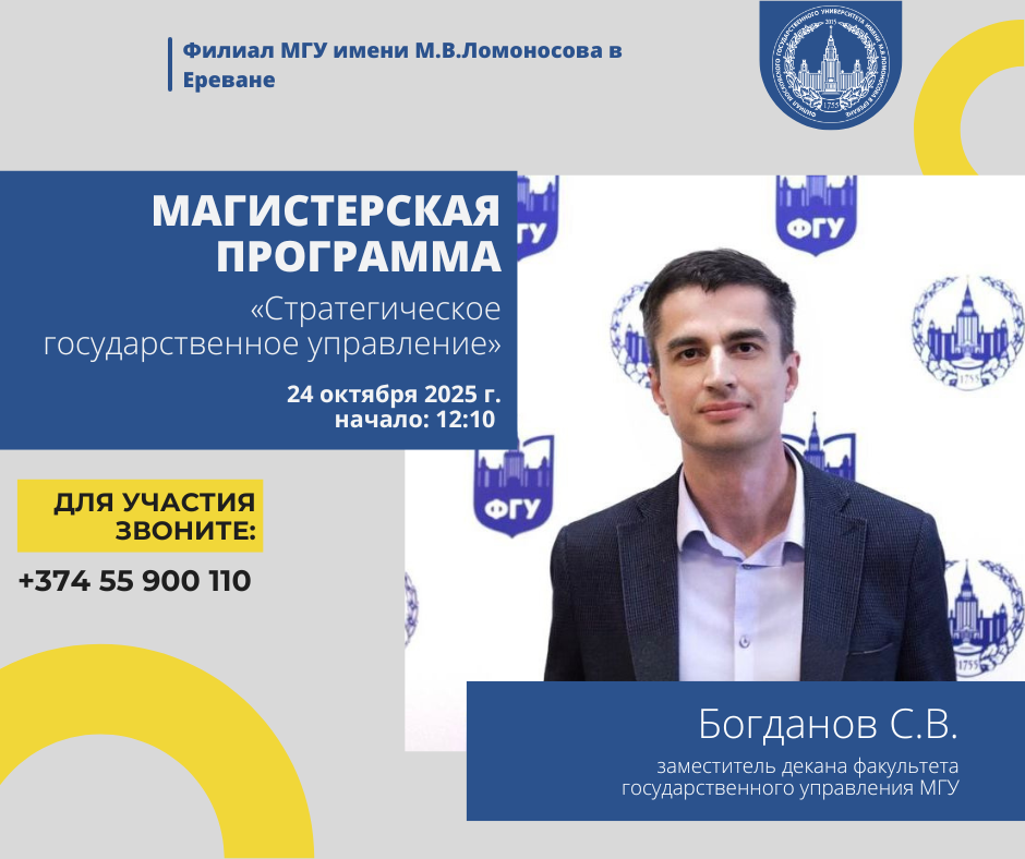 Филиал Московского государственного университета имени Михаила Васильевича Ломоносова в городе Ереван объявляет о приеме документов по программам бакалавриата и магистратуры на 2025-2026 учебный год. Прием документов проводится по семи направлениям в бакалавриате: Международные отношения, Юриспруденция, Государственное и муниципальное управление, Лингвистика, Международная журналистика, Экономика, Прикладная математика и информатика и трем магистерским программам: Юриспруденция, Экономика, Международные отношения. […]