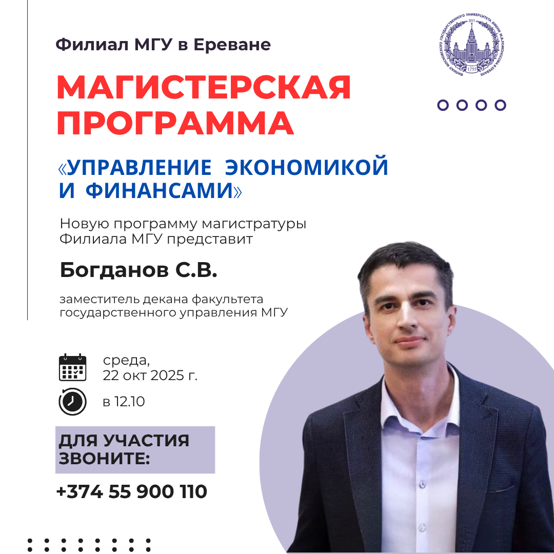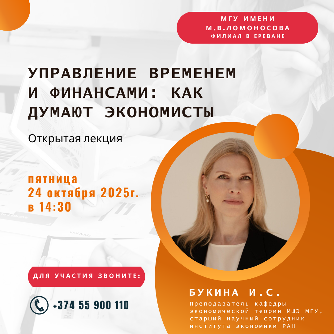 Тема лекции: «Управление временем и финансами: как думают экономисты» Лектор: Преподаватель кафедры экономической теории Московской школы экономики МГУ имени М. В. Ломоносова, старший научный сотрудник Института экономики РАН Ирина Сергеевна Букина. Дата мероприятия: 24 октября 2025 г. Начало: в 14:30 (по ереванскому времени) Мероприятие пройдет в очном формате по адресу: Филиал МГУ имени М.В. Ломоносова […]