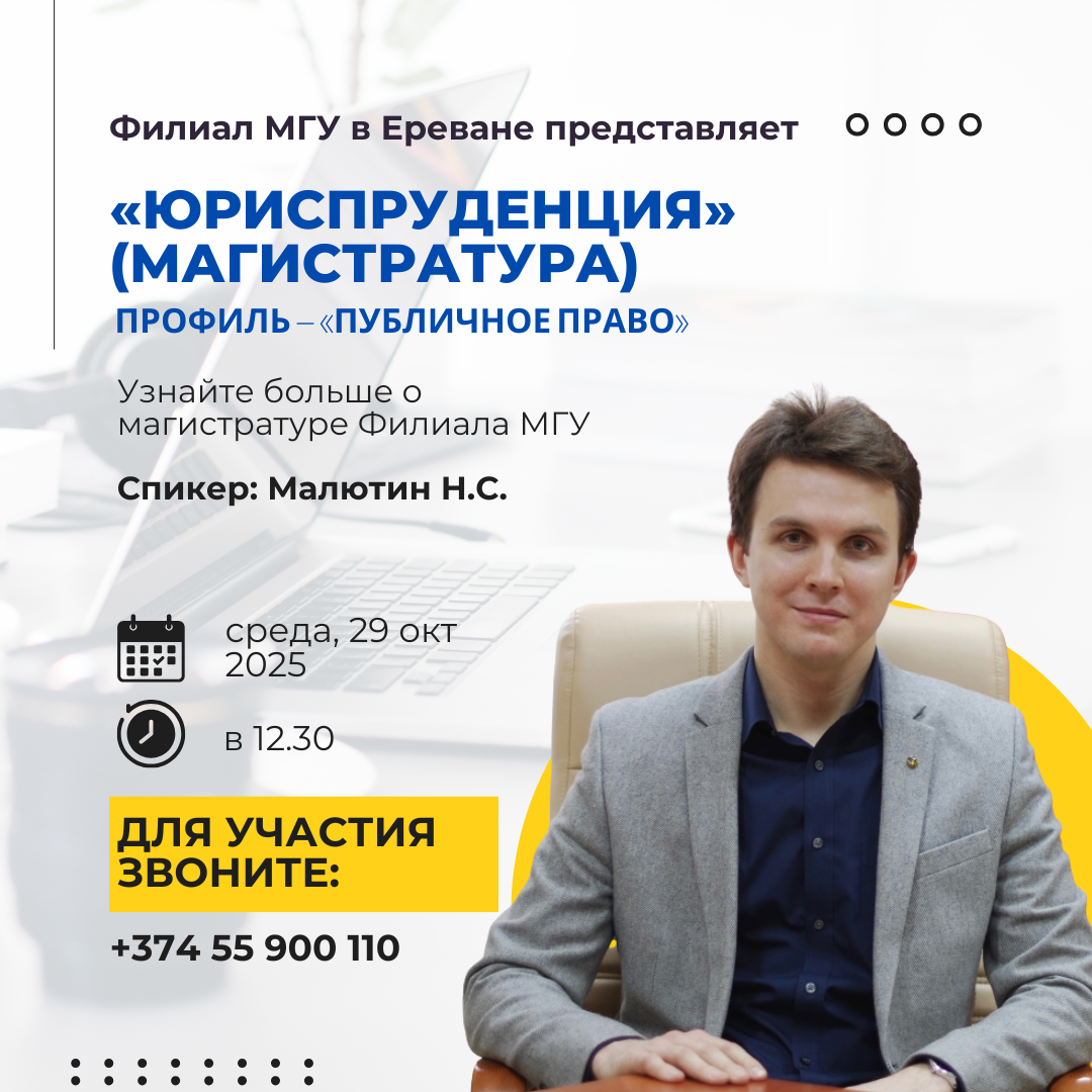 Презентация магистерской программы по направлению «Юриспруденция» (профиль – «Публичное право»)Дата мероприятия: 29 октября 2025 г.Начало: в 12:30 (по ереванскому времени)Формат: очноМесто проведения:Филиал МГУ имени М.В. Ломоносова в городе ЕреванРА, 0025 г. Ереван, ул. Вардананц, д. 17 Спикер:Малютин Никита Сергеевич – кандидат юридических наук, доцент, начальник магистратуры юридического факультета МГУ имени М.В. Ломоносова, доцент кафедры конституционного […]