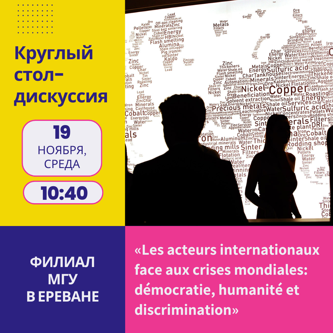 Тема круглого стола-дискуссии: «Международные акторы перед лицом мировых кризисов: демократия, гуманизм и дискриминация» («Les acteurs internationaux face aux crises mondiales: démocratie, humanité et discrimination») Дата мероприятия: 19 ноября 2025 г. Начало: в 10:40 (по ереванскому времени) Формат проведения: очный Место проведения: Филиал МГУ имени М.В. Ломоносова в городе Ереван, конференц-зал Адрес: РА, 0025 г. Ереван, […]