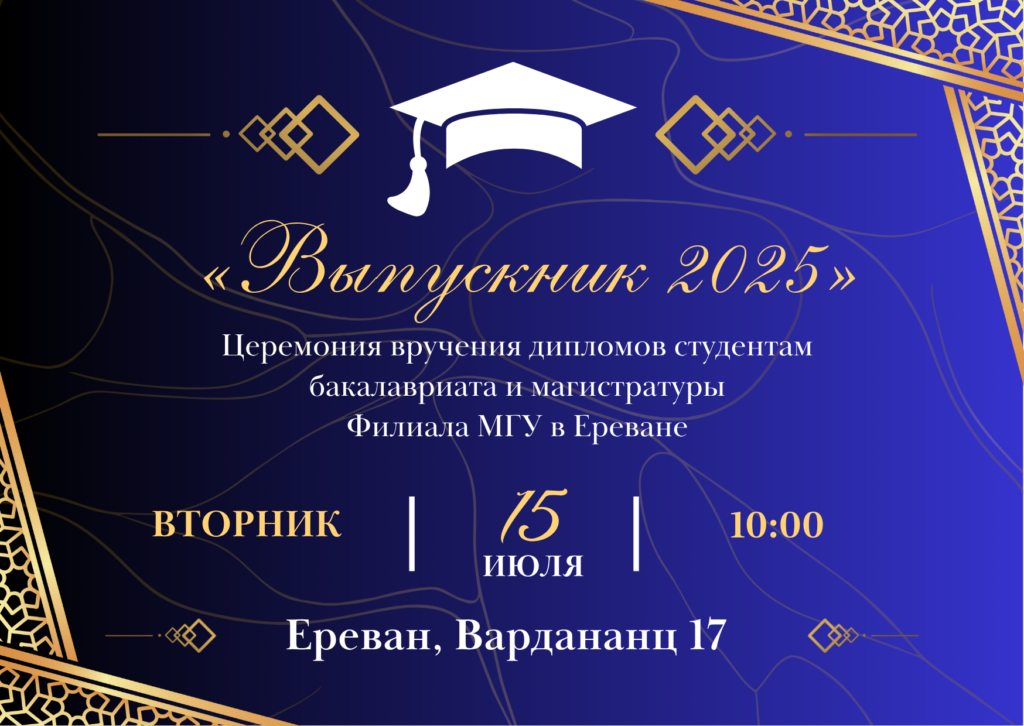 15 июля 2025 года в 10:00 в Филиале МГУ имени М.В. Ломоносова в городе Ереван начнется праздничная церемония вручения дипломов студентам бакалавриата и магистратуры Филиала МГУ в Ереване. Программа мероприятия включает приветственные выступления руководства МГУ и гостей праздника, торжественную церемонию вручения дипломов, прощальный танец выпускников, открытие совместно с Российским Центром Науки и Культуры в Ереване фотовыставки, посвященной истории Московского университета и Филиала МГУ в Ереване.