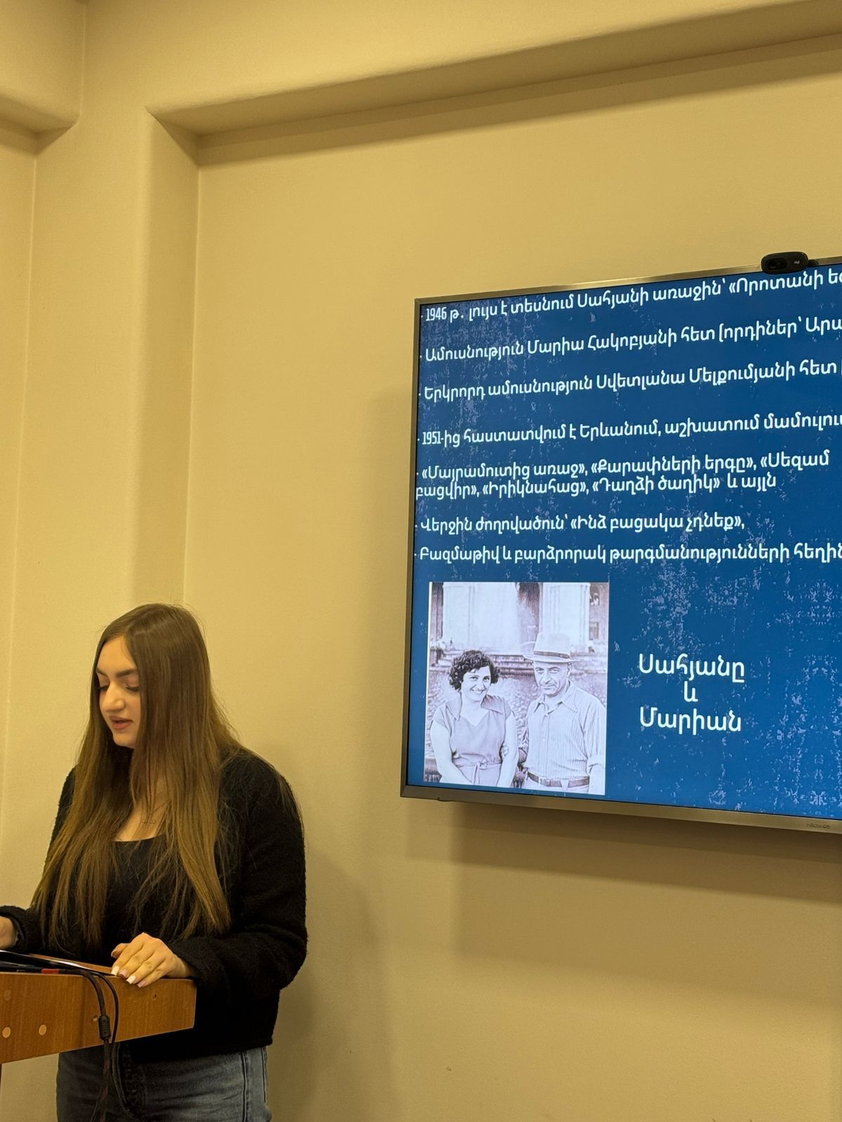 В мероприятии, посвященном жизни и творчеству А.Сагияна, приняли участие студенты 1-го курса направления подготовки «Международные отношения». В рамках мероприятия были представлены видеоматериалы из жизни поэта, прозвучали стихотворения о родине, любви и природе «Нас четверо было…», «На берегу Воротана», «Ну как мне встать и вот так уйти», «Когда я говорю: “Армения”…», «Ты, первая любовь моя», «Я устал», а также исполнены песни на стихи поэта.