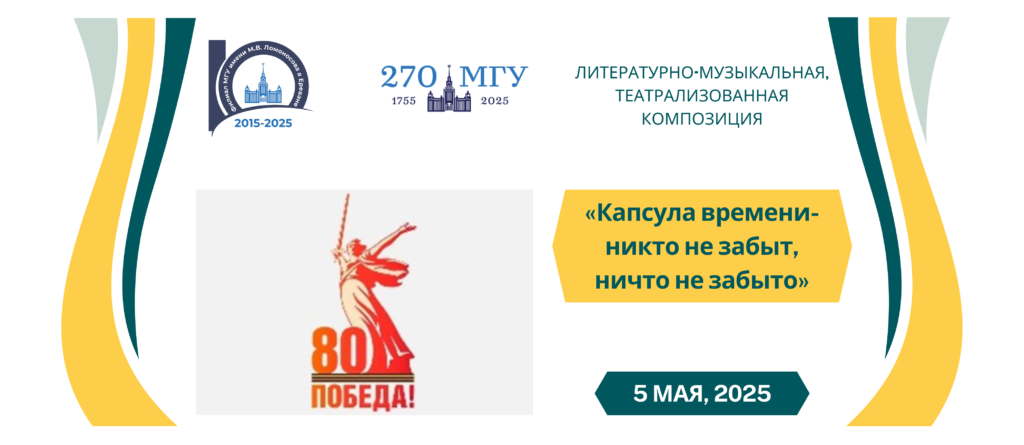 Филиал МГУ имени М.В. Ломоносова в городе Ереван приглашает студентов бакалавриата и магистратуры, преподавателей и сотрудников, гостей Филиала посетить Литературно-музыкальную, театрализованную композицию: «Капсула времени- никто не забыт, ничто не забыто». В ходе мероприятия студенты различных направлений филиала представят сообщения о роли и вкладе армян в Великую Победу, сыграют в театрализованных представлениях по мотивам произведений русских писателей о войне: «А зори здесь тихие», «Судьба человека» «Василий Теркин», прочитают стихи военных лет советских поэтов: К. Симонова, Б. Окуджавы покажут танцевальные номера. Гости и участники мероприятия смогут пообщаться с ветеранами Великой Отечественной Войны, послушать песни военных лет в исполнении Военного оркестра Пограничного управления ФСБ РФ в РА, а также отведать солдатской каши, приготовленной на настоящей полевой кухне.