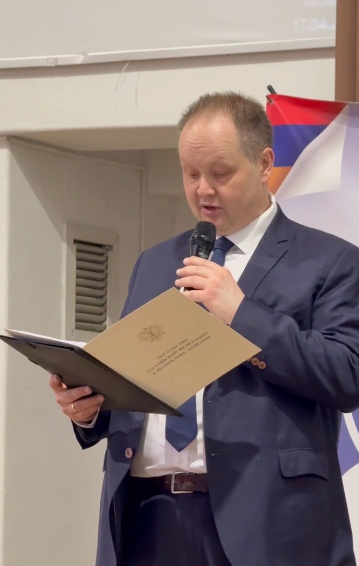 От имени Посольства Российской Федерации в Республике Армения участников конференции поприветствовал советник Посольства Александр Игоревич Новиков, который зачитал обращение Чрезвычайного и Полномочного посла РФ в Армении С.П. Копыркина.