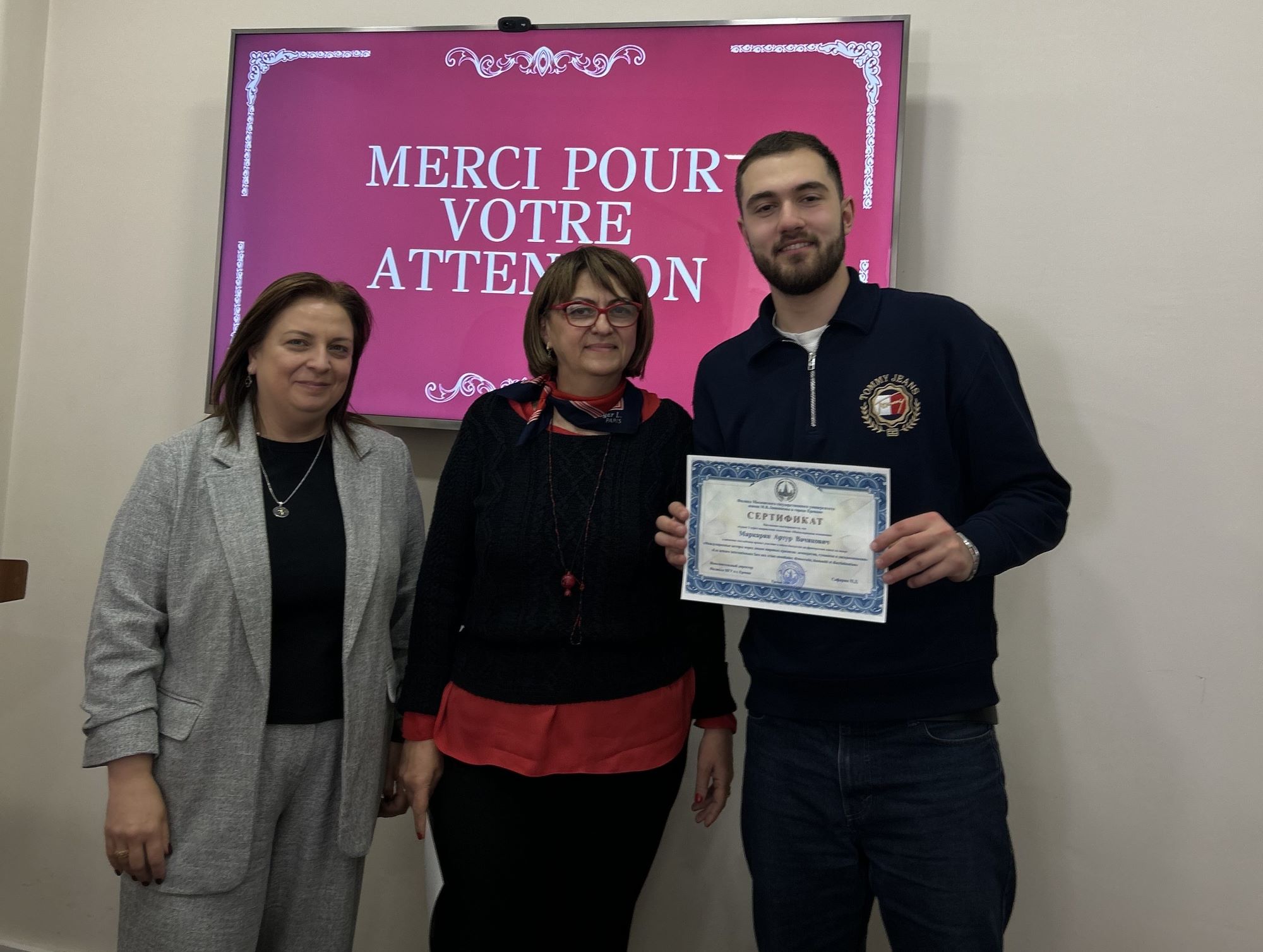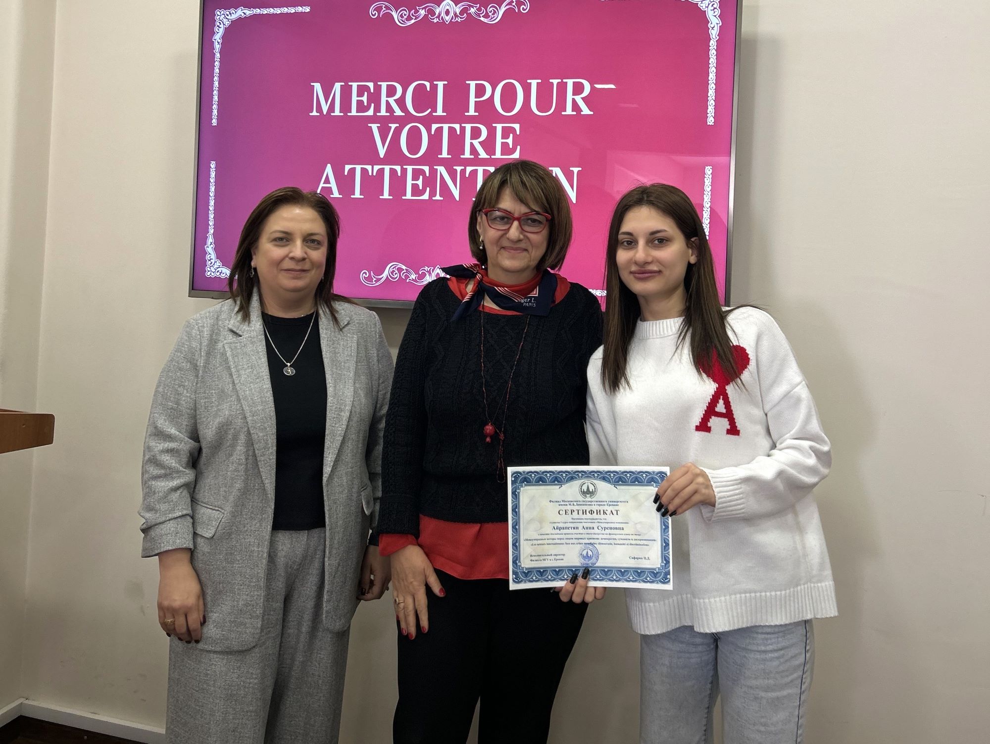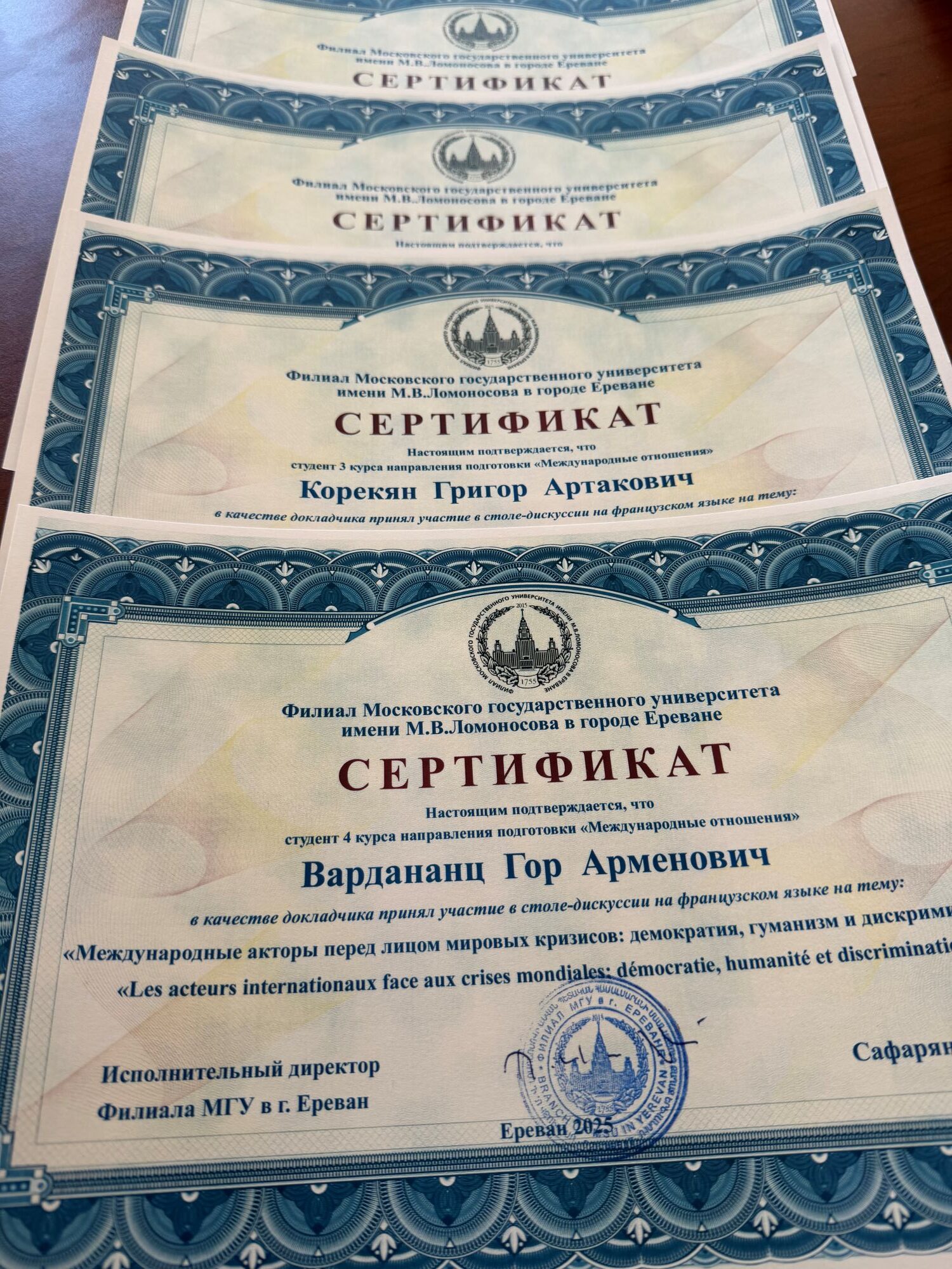 19 ноября 2025 года в конференц-зале Филиала МГУ имени М.В. Ломоносова в Ереване состоялся круглый стол-дискуссия на французском языке «Международные акторы перед лицом мировых кризисов: демократия, гуманизм и дискриминация». («Les acteurs internationaux face aux crises mondiales: démocratie, humanité et discrimination») Мероприятие прошло в рамках дисциплины «Французский язык» под руководством к.ф.н., доцента Л. А. Бабаян и доцента Л. Г. Карапетян.