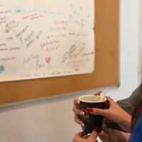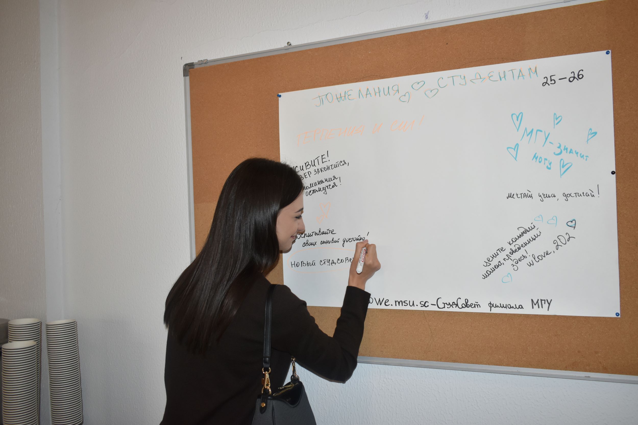 В течение дня для всех обучающихся работала небольшая зона с кофе и чаем, где студентов угощали горячими напитками. На стене разместили доску пожеланий — и она быстро наполнилась мотивирующими и вдохновляющими фразами: «Мечтай, учись, достигай», «МГУ — значит могу», «Цените каждый момент, проведённый здесь», «Люблю МГУ» и многими другими.