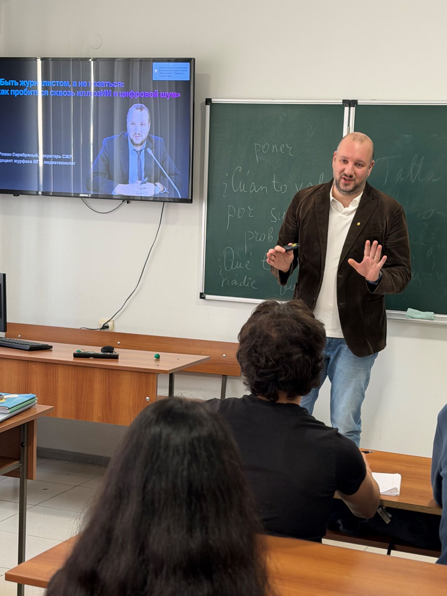 В ходе лекции обсуждалось, как сохранять профессиональные стандарты и собственную оптику в эпоху, когда платформы формируют информационное поведение аудитории, а технологии стремительно перестраивают медиапрактики. Серебряный подчеркнул, что «информационное поле влияет на всю нашу жизнь, и то, как мы позиционируем себя в нём, становится крайне важным». Он отметил и главный принцип, который хотел донести до студентов: «Технологии не заменят нас, если мы продолжаем думать. Не надо думать, что думать не надо».