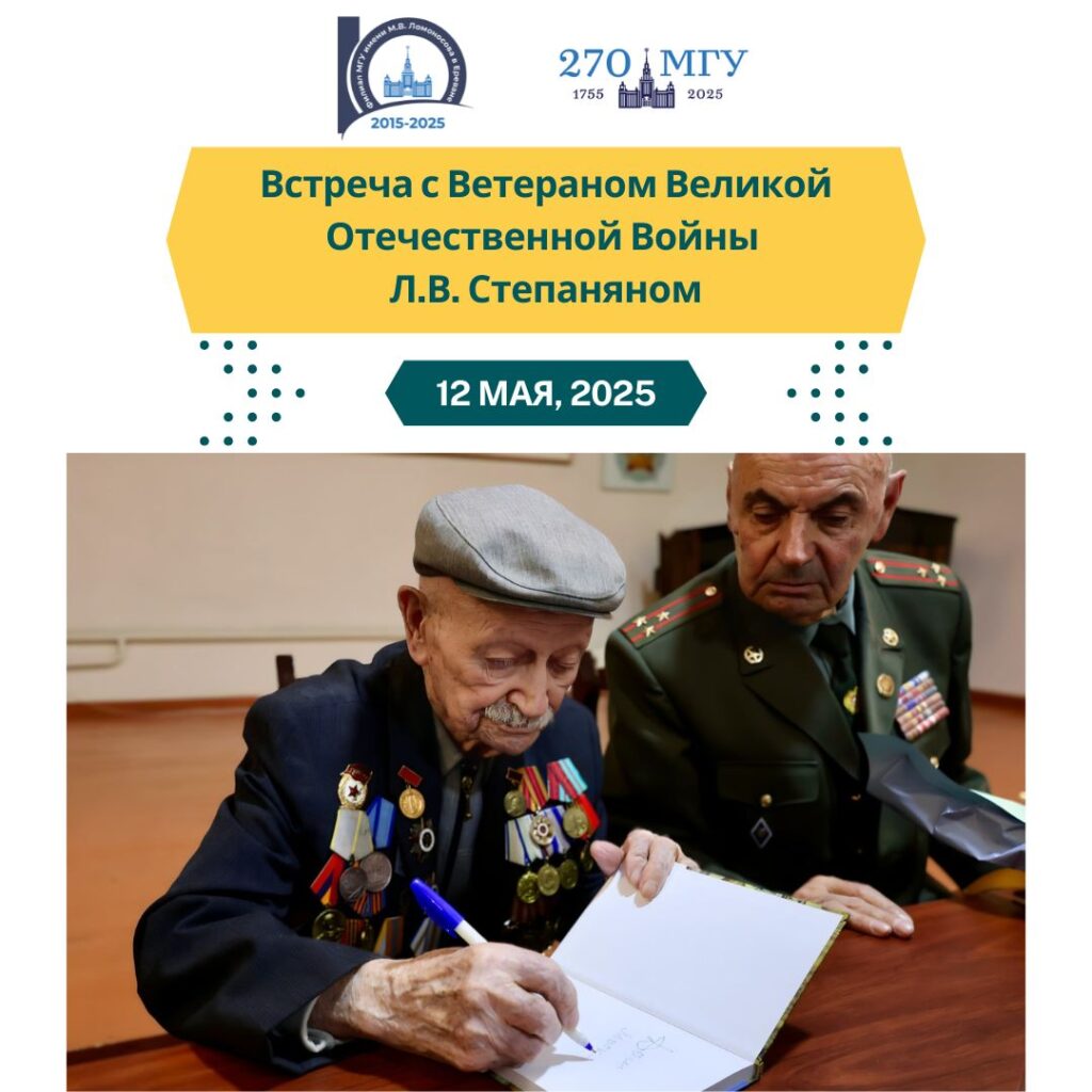 Филиал МГУ имени М.В. Ломоносова в городе Ереван приглашает студентов бакалавриата и магистратуры принять участие во встрече со столетним Ветераном Великой Отечественной Войны Лачином Вагаршаковичем Степаняном. В ходе встречи Лачин Вагаршакович представит студентам свою книгу стихов «Мое время, моя Победа. Стихи фронтовика», расскажет о пройденном боевом пути. Во встрече также примут участие: руководитель Объединения Ветеранов РА Симон Николаевич Есаян и литературовед и писатель Елена Алексеевна Шуваева. В рамках встречи состоится официальное вручение библиотеке Филиала книги Е.А. Шуваевой «Голоса Бессмертия», посвященной воспоминаниям армянских ветеранов Великой Отечественной Войны.