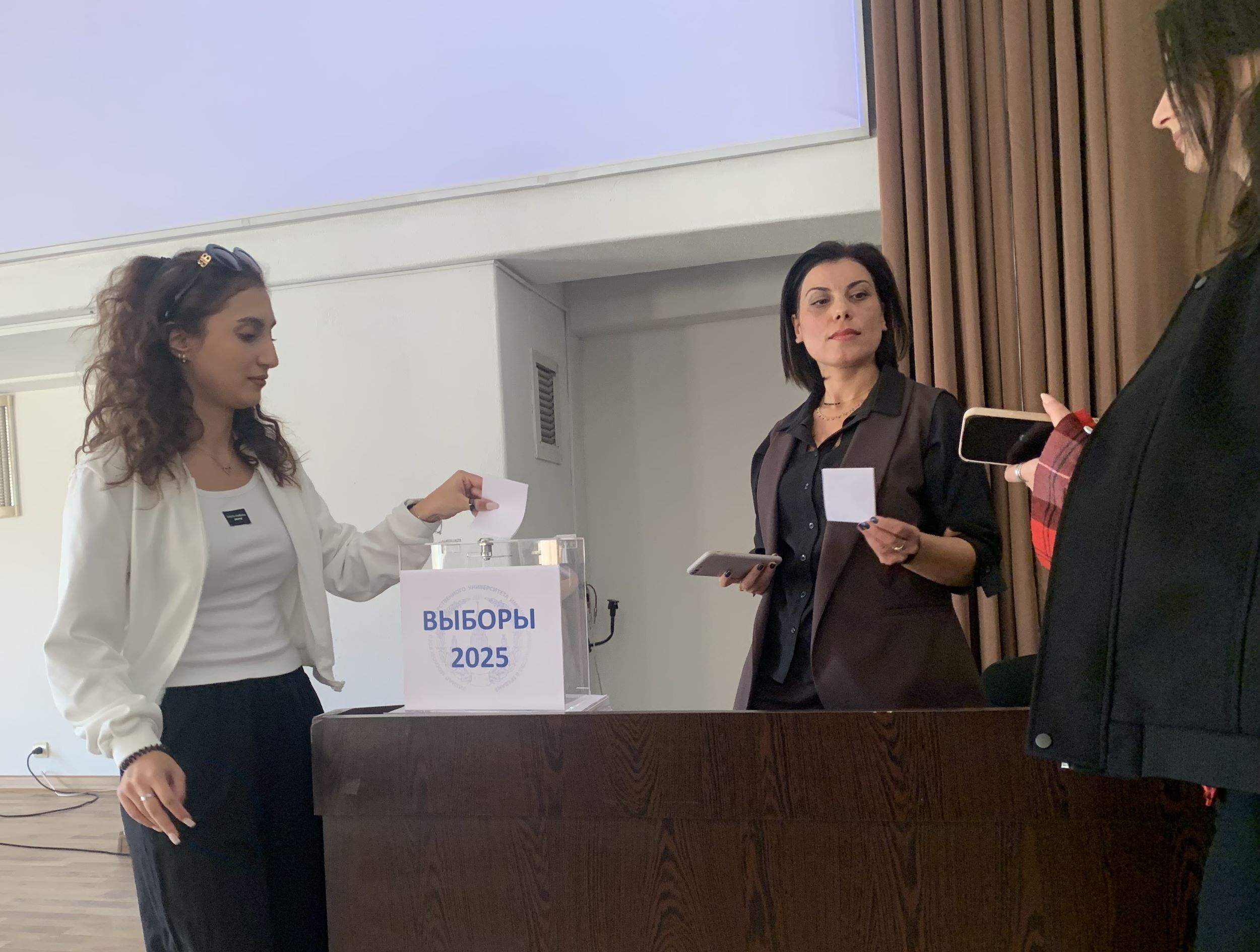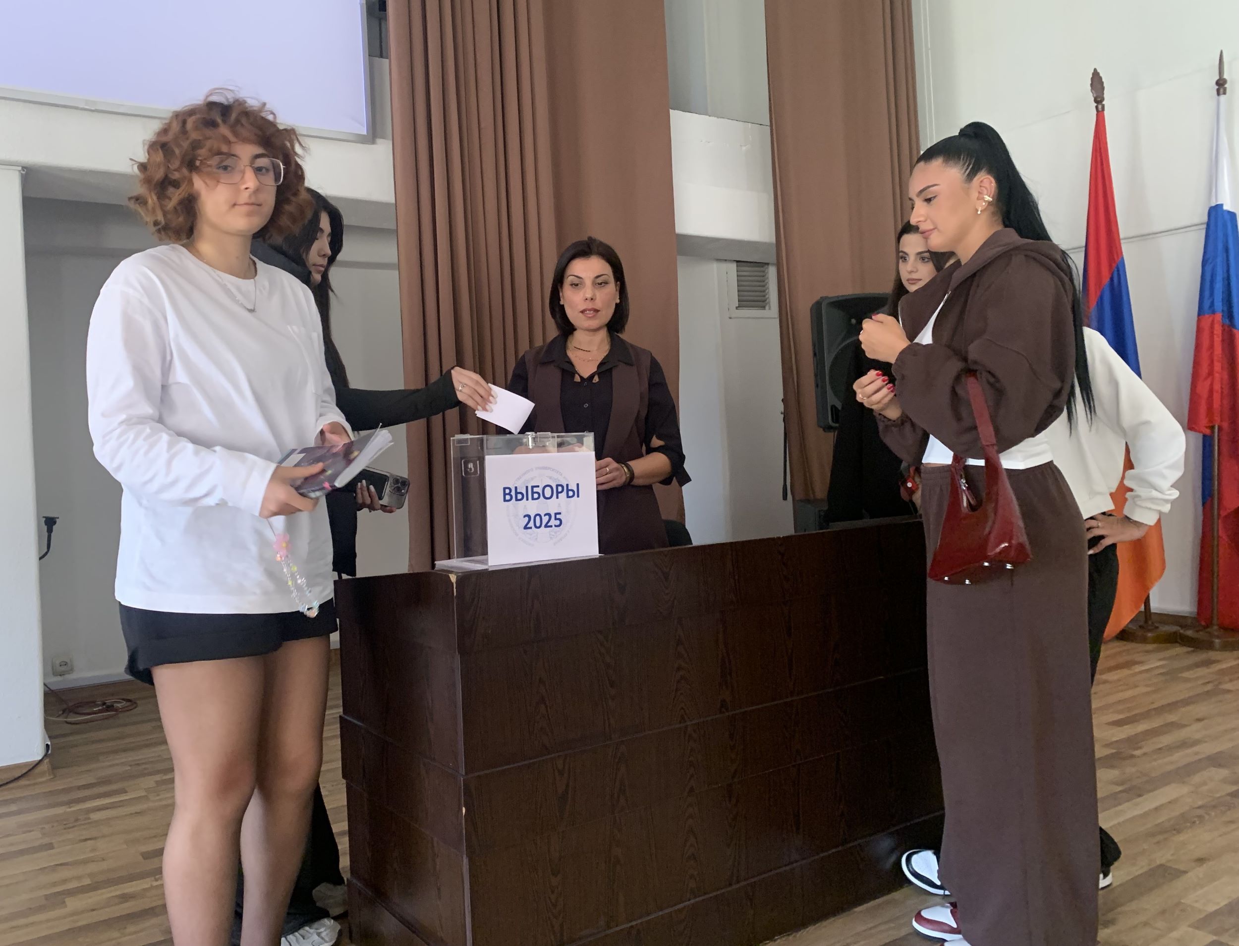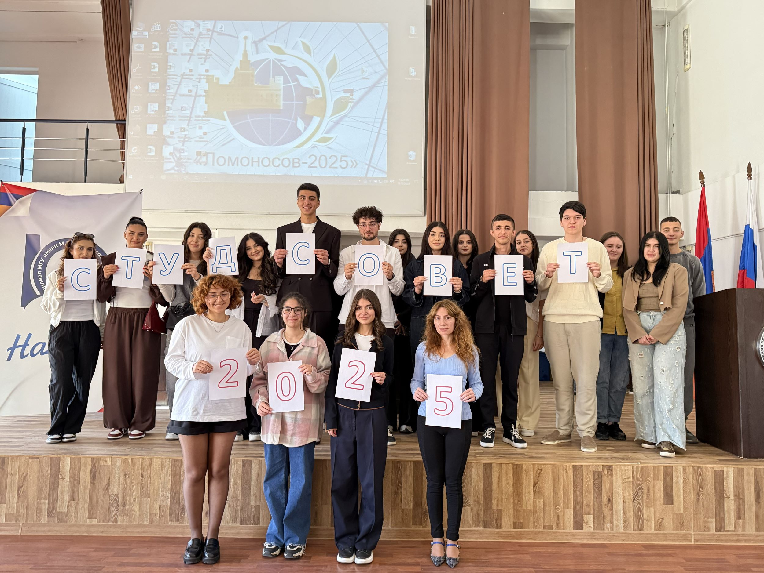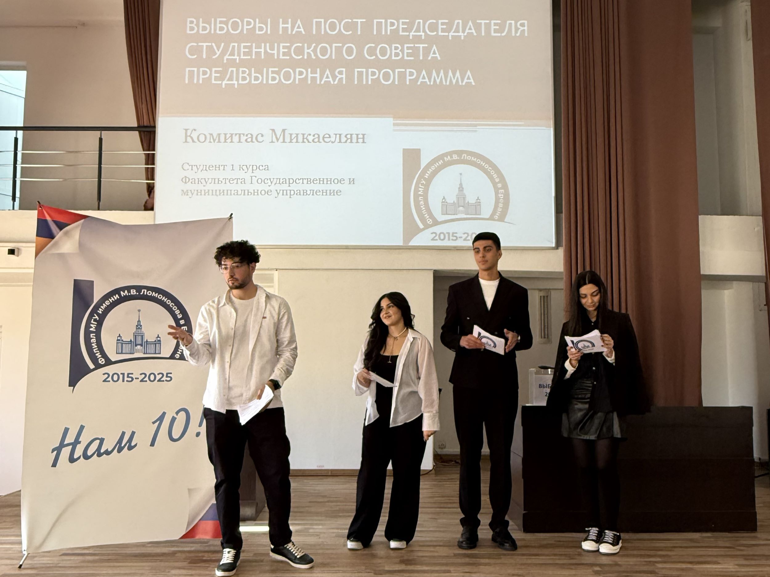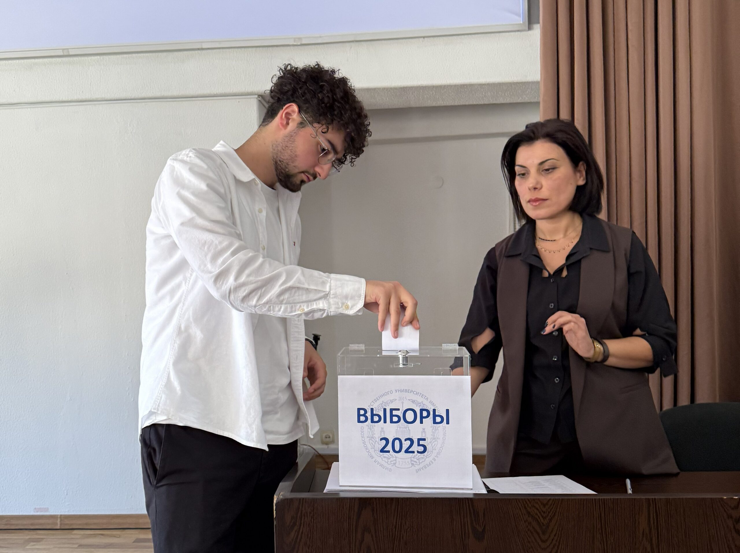 15 октября 2025 года в Филиале МГУ имени М. В. Ломоносова состоялись очередные выборы руководства Студенческого совета. За пост председателя боролись два кандидата: студент 2-го курса направления «Юриспруденция» Карен Петросян и студент 1-го курса направления «Государственное и муниципальное управление» Комитас Микаелян.